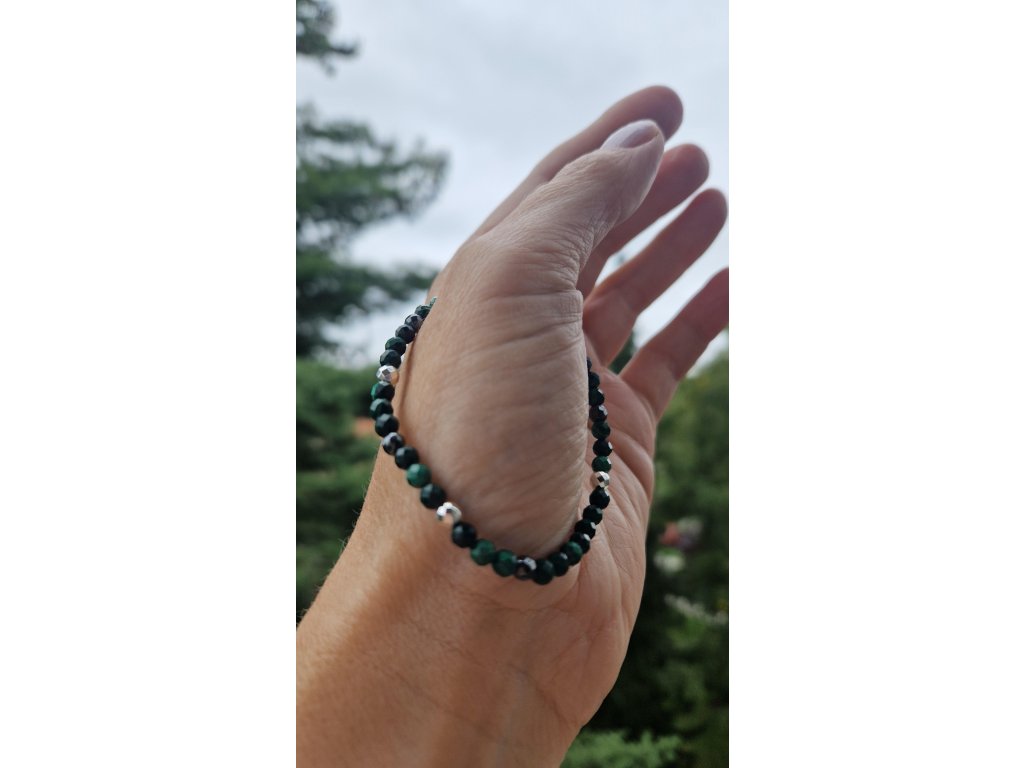 Elegantní náramek z broušeného malachitu (4 mm) doplněný o lesklé hematity. Na výběr varianta se stříbrnými nebo černými korálky. Nadčasový kousek, který zaujme na první pohled.