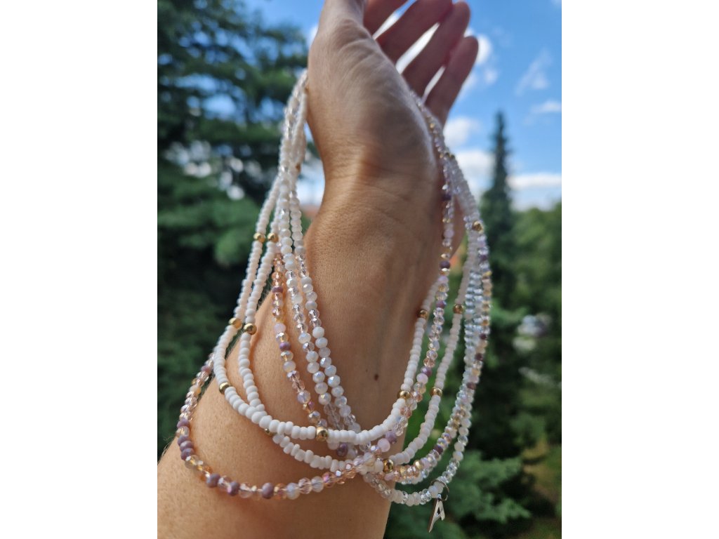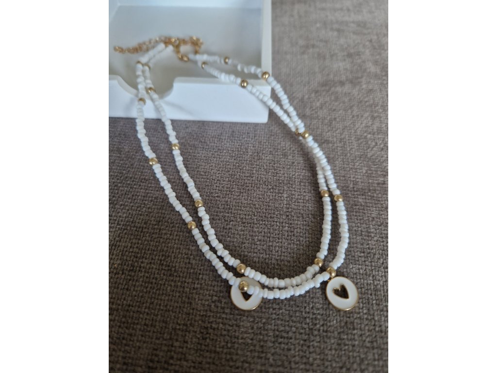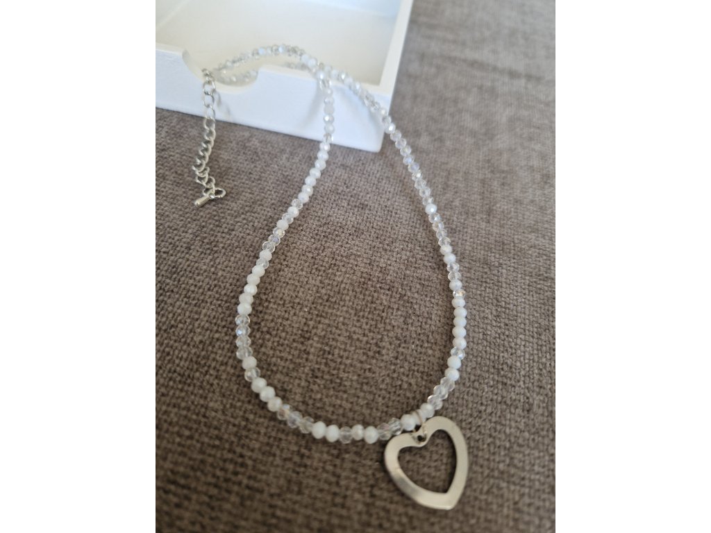 Jemný choker náhrdelník z drobných korálků. Bílá varianta se zlatými akcenty, průsvitná varianta se stříbrnými komponenty. Možnost doplnit o srdíčko z chirurgické oceli.
