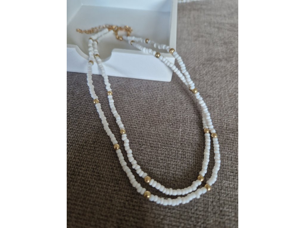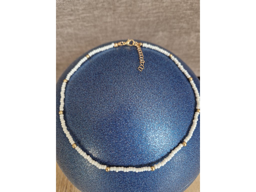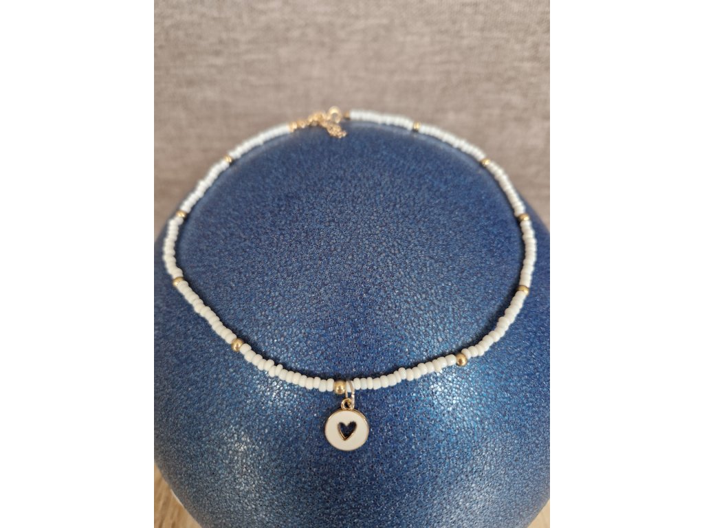 Bílý choker se korálky ve zlatém odstínu – čistý a elegantní design, možnost doplnit o bílé srdíčko se zlatými akcenty