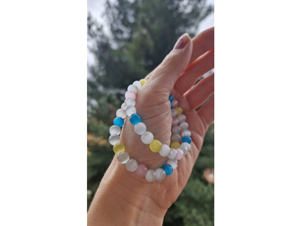 - Bílý s modrým, žlutým a růžovým selenitem