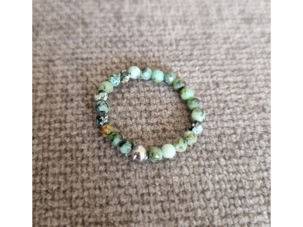 Minimalistický prstýnek z drobných broušených minerálních korálků v odstínech tyrkysové, zelené a černé. Každý kousek má originální kresbu i barevný tón, takže na ruce působí přirozeně a elegantně.