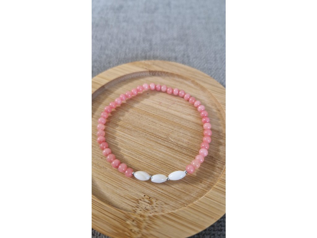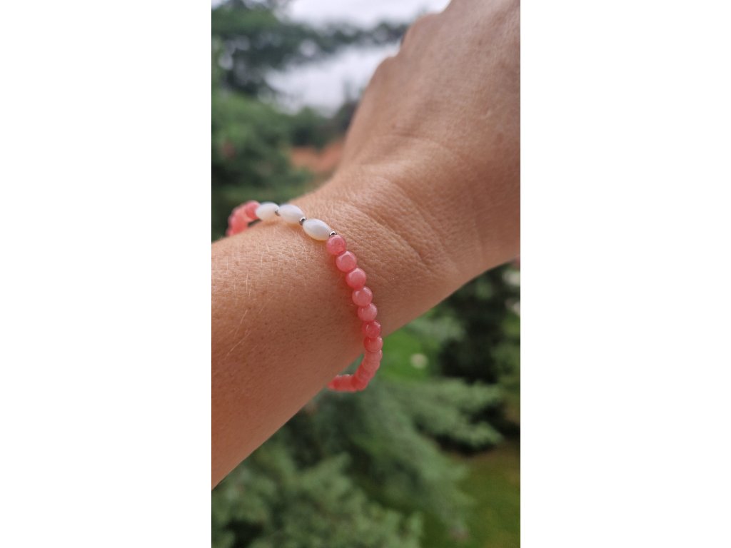 Elegantní náramek z mini korálků tmavě růžového jadeitu doplněný o tři bílé perličky. Jemný a zároveň výrazný šperk, který se hodí pro každou příležitost.
