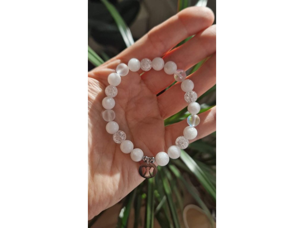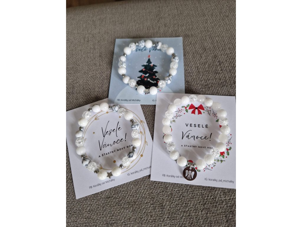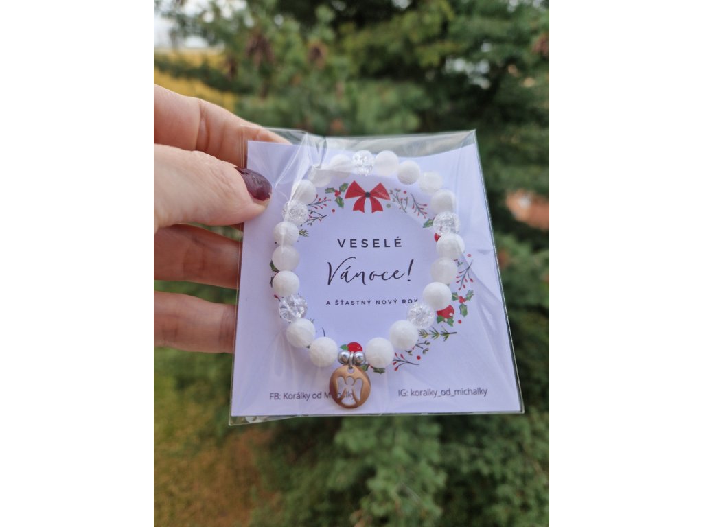 Jemný vánoční náramek v bílé kombinaci minerálů, který připomíná skutečnou sněhovou vločku. Elegantní a čistý doplněk, ideální jako dárek. Na výběr jsou tři vánoční kartičky.