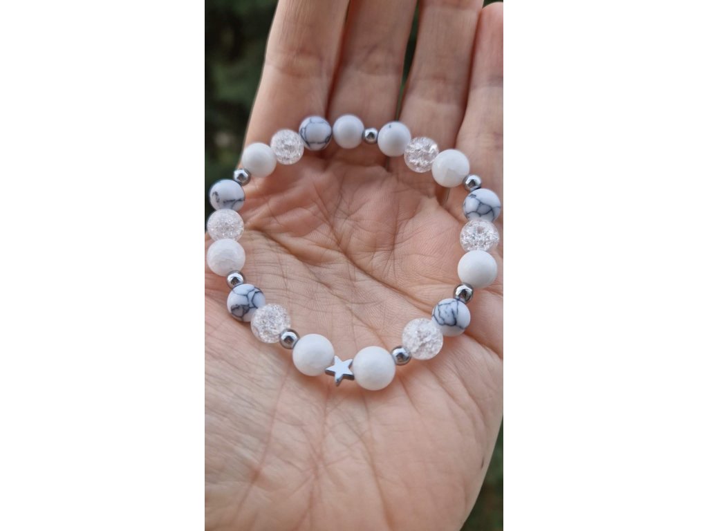 Kombinuje minerály křišťál, bílý nefrit, howlit a hematit.